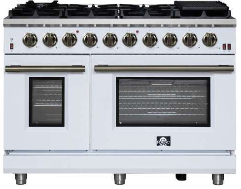 The Forno Massimo 48 Inch Gas Range in Black harmonizes professional style and durability with Antique Brass. Its 8 sealed burners, totaling 107,000 BTU, include a precision 20,000 BTU dual-ring burner that can simmer at 1,000 BTU. Continuous cast iron grates ensure stability on the enamel surface.Read More