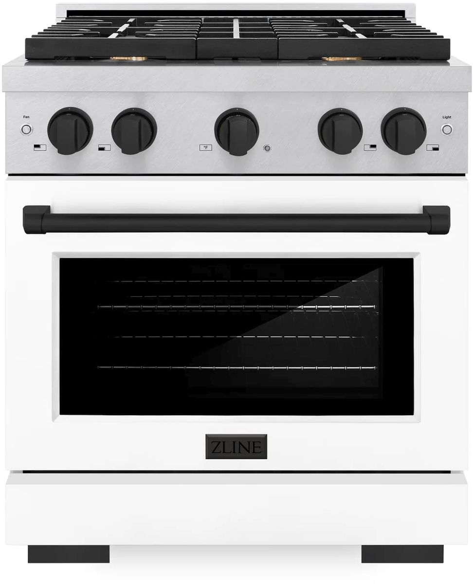 The ZLINE Autograph Edition 30 in. 4.2 cu. ft. Paramount Dual Fuel Range with 4 Burner Gas Cooktop and Electric Convection Oven in Satin Stainless Steel with White Matte Door and Matte Black Accents (SDRSZ-WM-30-MB) combines the versatility of a gas cooktop with 4 Italian-made auto-reignition burners, an electric convection oven with digital thermostat technology, enhanced cast iron grates, a beautiful white matte door with a Horizon window design, and elegant matte black knobs and handle allowing you to master every meal.