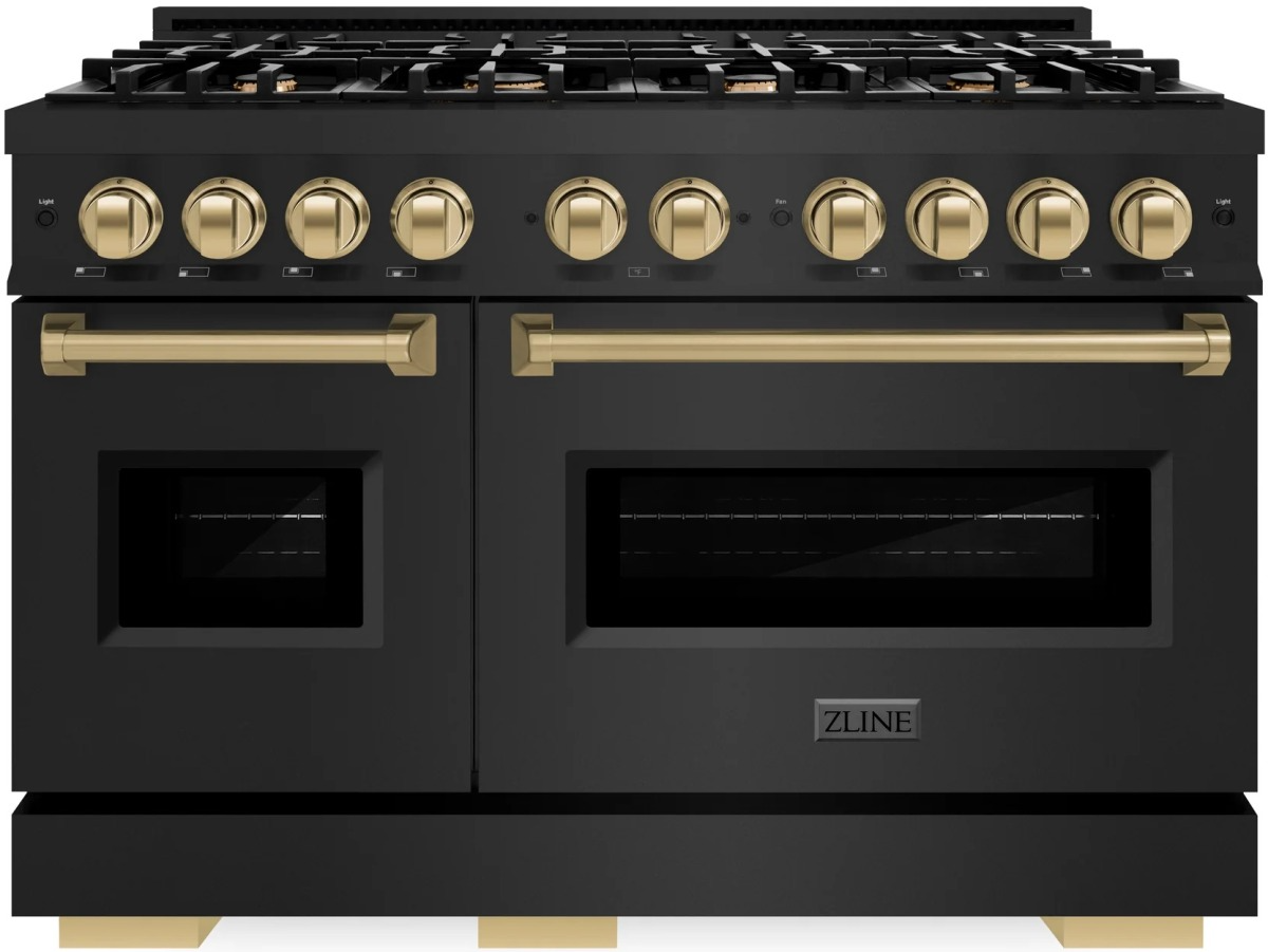 The ZLINE Autograph Edition 48 in. 6.7 cu. ft. Classic Double Oven Dual Fuel Range with 8 Burner Gas Cooktop in Black Stainless Steel and Champagne Bronze Accents (CDRBZ-48-CB) combines the elegance of a hand-finished porcelain gas cooktop with 8 Italian-made auto-reignition burners, a large electric convection oven with an energy-efficient cooling fan to ensure quiet operation and a small bake-and-broil oven with Landscape window designs, and stunning champagne bronze knobs and handles allowing you to master every meal.