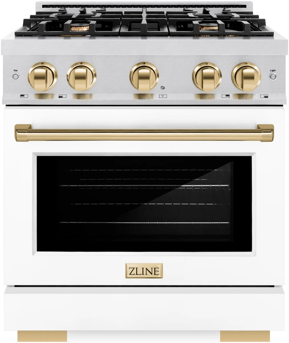 The ZLINE Autograph Edition 30 in. 4.2 cu. ft. Select Gas Range with 4 Burner Cooktop and Convection Gas Oven in Satin Stainless Steel with White Matte Door and Polished Gold Accents (HGRSZ-WM-30-G) combines the elegance of a hand-finished porcelain gas cooktop with 4 Italian-made auto-reignition burners, a gas convection oven with an energy-efficient cooling fan to ensure quiet operation, a beautiful white matte door with a Horizon window design, and stunning polished gold knobs and handle allowing you to master every meal.